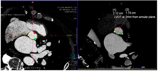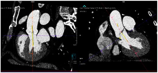 These scans are typically analyzed by a trained cardiologist or radiologist and are labor-intensive. Artificial intelligence algorithms have been developed for automating the critical steps from CTs, such as determining the aortic valve annular plane (Figure 1) and determining the access route (Figure 2). By leveraging machine learning techniques, these algorithms can measure the aortic annulus and aid device sizing with great precision, minimizing human error and optimizing patient-specific treatment strategies [,,]. Santaló-Corcoy et al. developed TAVI-PREP, a fully automated deep learning-based method, for pre-TAVI planning. TAVI-PREP uses MeshDeformNet for 3D surface mesh generation and a 3D Residual U-Net for landmark detection. TAVI-PREP is designed to extract 22 different measurements from the aortic valvular complex. The mean absolute relative error was within 5% for most measurements, except for left and right coronary height []. During the TAVR procedure, an optimal view is essential when the X-ray tube C-arm is perpendicular to the aortic annulus plane, as this allows the operator to achieve appropriate delivery of the valve. Theriault Lauzier et al. developed a convoluted neural network to infer the location and orientation of the aortic valve annular plane. The proposed algorithm had accuracy on par with proposed automated methods for localization and approaches an expert-level accuracy. Here, note that the method is not specific to the aortic valve and may be generalizable to other anatomical features []. Samin et al. developed an automated method in which a 3-D model derived from cardiac CTs can be used to predict the best line of perpendicularity of the proposed TAVR valve, and thus provide the best C-arm angle for alignment of the new valve with the aortic valve annulus [].