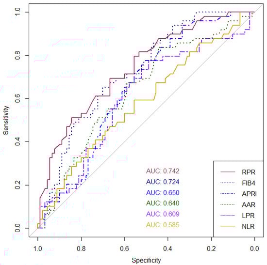 In this study, we investigated six non-invasive serum biomarkers to predict cirrhosis in patients with AIH or overlap AIH-PBC patients, including APRI, FIB-4, AAR, NLR, LPR, and RPR, as mentioned earlier. In the entire cohort, the AUROCs of the biomarkers shown in descending order are as follows: RPR (0.742), FIB-4 (0.724), APRI (0.650), AAR (0.640), LPR (0.609), and NLR (0.585), respectively (Figure 1). RPR was significantly superior to APRI (p = 0.029), NLR (p = 0.023), and LPR (p = 0.016) for the diagnosis of cirrhosis status, while it was non-significantly higher than FIB-4 and AAR. For the subgroup of AIH-PBC overlap syndrome patients, the AUROC of the RPR was still the highest among all the evaluated biomarkers (0.915). The AUROCs of all biomarkers in the AIH and AIH-PBC subgroups are shown in Table 3.