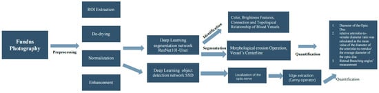 After pharmacological pupil dilation, Fundus photography with 45° centered on the optic disc and macular was taken using a Canon retinal camera. Fundus image AI-based software EVision [12,13] was used to intelligently identify fundus blood vessels from fundus images and automatically identify and mark the margin of the optic disc with manual corrections to calculate the diameter of blood vessels. The software integrates artificial intelligence image processing technologies such as computer vision and deep learning (Figure 1). For the fundus image to be processed, it performs four preprocessing operations: ROI extraction, de-drying, normalization, and enhancement to remove the non-fundus structure area, reduce image noise, increase the sharpness of image feature edges, and reduce the difference between images [14,15]. The deep learning segmentation network model ResNet101-Unet was used for retinal vascular segmentation. After obtaining the segmentation results of the blood vessels, based on the features of color, brightness, and the connection and topological relationship of the blood vessels in the fundus, arterial and venous blood can be distinguished and identified. For optic disc segmentation, the deep learning object detection network SSD was used for localization of the optic disc, then the fundus image was transformed in polar coordinates, and the edge extraction algorithm based on the Canny operator was used to obtain the edge of the optic disc in polar coordinate and realize the fine segmentation of the optic disc [12]. Based on the retinal vessel segmentation results of the fundus, the morphological erosion operation is performed on it to obtain the vessel’s centerline. An orthogonal straight-line tangent to a point on the centerline intersects two points on the edge of the vessel, and the distance between the two points is the centerline. The vessel diameter corresponds to this point. Based on the results of optic disc segmentation, the diameter of the smallest circumscribed circle of the optical disc was taken as the diameter of the optic disc (DD), and the average diameter of arteries and veins within 1.0–1.5 DD from the center of the optic disc was calculated. A pixel density histogram marked the boundaries. The retinal arterioles and venules were outlined in different colors and measured (the green and yellow arrows, Figure 2). All traced arterioles and venules were divided into at least ten sections, and the relative arteriolar-to-venular diameter ratio was calculated as the mean value of the diameter of the arteriolar-to-venular/the average diameter of the optic disc [16,17].
