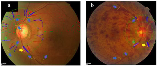 AI-based image analyzer (EvisionAI, Beijing, China) quantifies the retinal blood vessel geometric parameters in the RVO-affected eyes. (a) showed the measurement in the BRVO-affected eye. (b) showed the measurement in the CRVO-affected eye. The yellow grottos pointed by the blue arrows in (a,b) represent the first angle at the vascular bifurcation. The relative arteriolar orvenular diameter was calculated as the mean value of the diameter of the arteriolar or venular/the average diameter of the optic disc. Green arrow: retinal vein. Yellow arrow: retinal artery. Green circles: the radius of these circles is 0.5 DD, 1 DD and 1.5 DD at the center of the optic disk respectively. BRVO: Branch retinal vein occlusion. CRVO: Central retinal vein occlusion. AI: Artificial intelligence. DD: the diameter of the optic disc.
