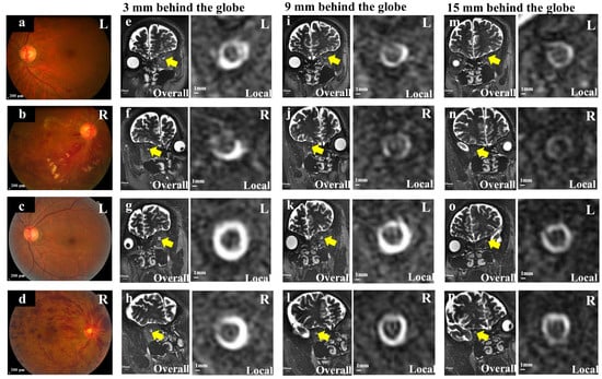 MRI images showed the ONSASW 3 mm, 9 mm, and 15 mm behind the globe in RVO eyes (color photos). (a,b): The color fundus photography of BRVO-affected or contralateral normal eyes. (c,d): The color fundus photography of CRVO-affected or contralateral normal eyes. (e–p) showed an oblique coronal T2WI-FRFSE image with fat suppression to demonstrate the optic nerve sheath complex taken at 3 mm (e–h), 9 mm (i–l), and 15 mm (m–p) behind the globe. (a,b,e,f,i,j,m,n): A 49-year-old man with BRVO and contralateral normal eyes. (c,d,g,h,k,l,o,p): A 51-year-old man with CRVO and contralateral normal eyes. Yellow arrow: ONSASW. BRVO: Branch retinal vein occlusion. CRVO: Central retinal vein occlusion. ONSASW: Optic nerve subarachnoid space width.
