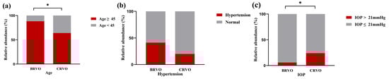 Comparisons of the baseline characteristics between BRVO and CRVO groups. A Chi-squared test was used to compare proportions of age (a), hypertension (b), and IOP (c). * Statistically significant: p < 0.05. BRVO: Branch retinal vein occlusion. CRVO: Central retinal vein occlusion. IOP: Intraocular pressure.