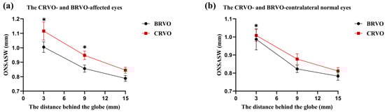 Comparisons of ONSASW at the distances of 3 mm, 9 mm, and 15 mm behind the globe between the CRVO- and BRVO-affected eyes and the CRVO- and BRVO-contralateral normal eyes. Group comparisons were analyzed by one-way analysis of variance (ANOVA). * Statistically significant: p < 0.05. BRVO: Branch retinal vein occlusion. CRVO: Central retinal vein occlusion. ONSASW: Optic nerve subarachnoid space.