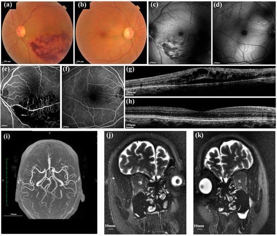 Advanced multimodal images of a 62-year-old female with BRVO in the left and normal contralateral right eyes. The best corrected visual acuity was 20/70 in the left eye and 20/30 in the right eye. Intraocular pressure was 18 mmHg in both eyes. Color fundus photos showed diffuse hemorrhages in the inferior temporal quadrant in the left eye (a), and the right eye looks normal (b). Infrared images of the left (c) and right eye (d). A late-phase frame of the fluorescein angiogram demonstrates dilated, tortuous veins with the area of fluorescein blockage in the left eye (e); the right eye looks normal (f). OCT image of the left eye shows the intra- and sub-retinal fluid and hyper-reflective foci in the inner retina (g), and the macular structure in the right eye is normal (h). The MRI imaging showed a reduced number of the middle cerebral artery and its branches in the affected left eye (i). The ONSASW behind the bilateral globe showed no difference using the MRI ((j,k); oblique coronal T2WI-FRFSE image with fat suppression). The advanced stage of BRVO, complicated by macular edema, showed that the retinal vessel was intensively affected, which correlates with impaired cerebral vessels. This case also showed that the ONSASW did not significantly differ from the contralateral eye, further supporting the hypothesis that BRVO may have a close relationship with cerebrovascular events, not glaucoma. BRVO: Branch retinal vein occlusion. ONSASW: Optic nerve subarachnoid space width. OCT: Optical coherence tomography.