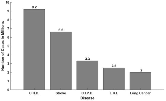 Coronary artery disease (CAD) stands as a leading cause of mortality in the majority of developed countries []. According to the British Heart Foundation (BHF) [], coronary heart disease was the main cause of death in the year 2021 around the world. In Figure 1, a comparative chart of different death causes with data extracted from the BHF is illustrated.