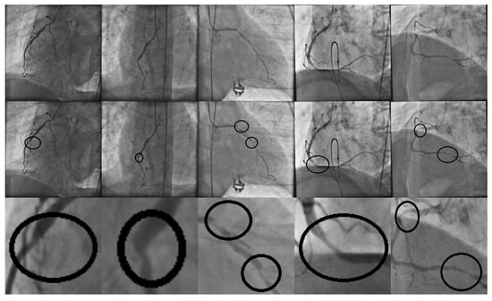 In coronary artery disease, atherosclerosis leads to the development of coronary stenosis at various locations []. Nowadays, X-ray coronary angiograms are the gold standard for the detection of coronary stenosis in clinical practice. Consequently, a cardiology specialist must exhaustively examine the entire angiogram, and according to their expertise, all regions in which coronary stenosis cases can occur are labeled by hand. Figure 2 presents X-ray coronary angiogram samples with stenosis regions labeled by a specialist in cardiology.
