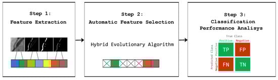 The proposed strategy consists of three stages. The first stage corresponds to the feature extraction in order to form a bank of 473 features involving intensity, shape, and texture types. For shape features, 8 vessel enhancement methods from the state-of-the-art were used. In the second stage, a subset of features is selected (feature selection) by using a hybrid-evolutionary algorithm in order to maximize the classification accuracy in training data while minimizing the number of features. In the final stage, the selected subset is tested for the classification of coronary stenosis using an independent test set of angiograms. In Figure 3, the steps of the proposed strategy are illustrated.
