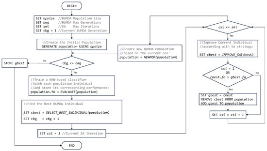 BUMDA [] is a population-based method that uses the estimation of distribution to generate new individuals. The main idea of BUMDA is the use of a distribution probability computed from the best solutions of the current generation in order to generate the new one []. The Boltzmann probability distribution used by BUMDA is calculated as follows: