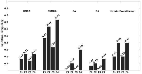 Frequencies for each selected feature in the best solution achieved by the hybrid-evolutionary method contrasted with the frequency for that same feature in the best solution achieved by the other methods. Selected features are as follows: Frangi filter—mean intensity (F1), Frangi filter—mean std. dev. of segments length in all arterial sections (F2), linear multi-scale filter—gradient mean (F3), top-hat—gradient coefficient of variation (F4).