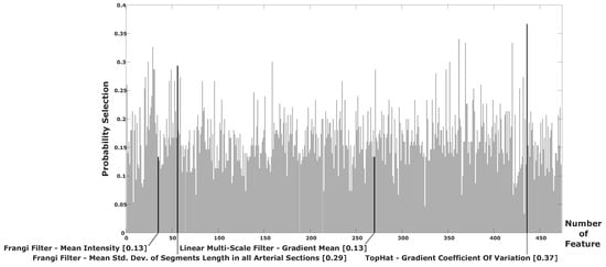 Table 4 shows that the highest classification rate in terms of the accuracy and Jaccard coefficient metrics was also achieved by the proposed method, along with the SVM-based classifier. This result is relevant because it shows that the SVM classification performance is competitive using the bank of four features. Similarly, results obtained using the KNN-based classifier were close to those achieved by the SVM, also using the feature vector. Consequently, the accuracy and Jaccard coefficient rates show how competitive the feature subset was in classifying stenosis cases. An analysis of the frequency for each of the selected features is described in Figure 8.