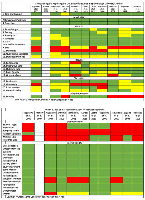 - Hoy, D.; Brooks, P.; Woolf, A.; Blyth, F.; March, L.; Bain, C.; Baker, P.; Smith, E.; Buchbinder, R. Assessing risk of bias in prevalence studies: Modification of an existing tool and evidence of interrater agreement. J. Clin. Epidemiol. 2012, 65, 934–939. [Google Scholar] [CrossRef] [PubMed]
