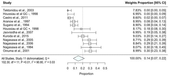 | 3 | Nagasawa et al. [28] | 1994 | Japan | 14 | 46 | 33.1 | 17 | NA | 100 | 39.1 | 19.57 | 36 |