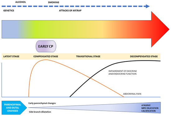 The term ‘early-stage CP’ was first used by Ammann et al. in 1996 to stratify patients of alcoholic CP before they would develop typical clinical features of CP [5]. The term was introduced as a bridge between alcoholic acute pancreatitis (AP) and CP. American pancreatic Association (APA) and United European Gastroenterology (UEG) evidence-based guidelines on CP were published in 2014 and 2017, respectively. However, none of them could define early CP due to insufficient evidence. Meanwhile, in an international consensus in 2016, Whitcomb et al. proposed a mechanistic definition of CP and adopted the progressive model of CP, characterised by five stages: at risk, acute pancreatitis (AP)-recurrent AP, early CP, established CP, and end-stage CP [6]. Thus, the diagnosis of early CP is conceptualized based on risk factors, inflammatory markers, clinical features, and structural and functional alteration in the gland, and not upon the duration of the disease.