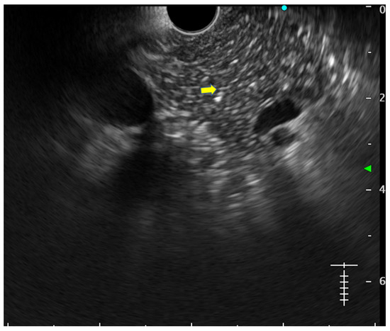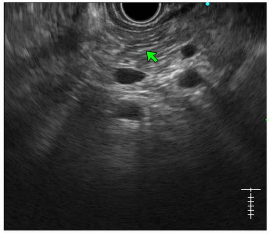 - Hyperechoic margin of the MPD: It is described when the hyperechoic ductal wall over at least 50% of the MPD is demonstrated in the body and the tail of the pancreas. In a linear echoendoscope, MPD assessment on a long axis is difficult. Thus, this finding is often subjective and has low interobserver agreement [34]. Histologically, they correspond to periductal fibrosis. In the study by Sekine et al., the hyperechoic MPD wall was described to correlate with the thinning of the ductal wall on surgical specimens [33] (Figure 2).