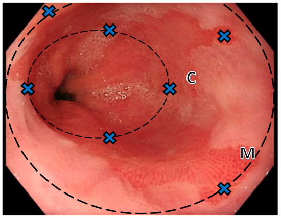 Once a Barrett’s segment has been identified endoscopically, it should be measured using the Prague classification (Figure 1), where C = the length of circumferential Barrett’s from the GOJ and M = the maximal length, i.e., the most proximal point of any of the tongues [18]. As well as describing the extent of BE and any islands proximally, the location of the squamo-columnar junction, diaphragmatic pinch and any hiatus hernia present should also be documented. Despite the validated Prague classification system, overdiagnosis remains a prevalent issue; in one retrospective study, 32.3% of patients with a previous diagnosis of BE had their diagnosis revised to no BE after a consensus review [19]. As such, biopsies at endoscopy should not be routinely taken for irregular Z-lines or non-circumferential tongues of CLO <1 cm [13,20].