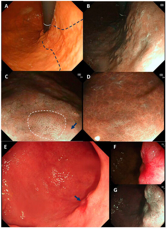 Atrophic gastritis, gastric IM and early cancer. (A,B) show the appearance in retroflexion of pan-atrophy with widespread gastric IM. With white light (A), there is an uneven surface with patchy erythema; in NBI (B), the uneven surface is accentuated and the elongated groove-type pit pattern can be seen. In (C,D), near-focus NBI allows closer interrogation of the surface pit pattern, with the white opaque substance (WOS) on IM visible in (C) (circled by dashed line) and adjacent normal corpus pits (blue arrow). (D) shows an example of multifocal gastric IM seen with NBI with near focus. In (E), an early gastric cancer is visible (blue arrow) along the distal greater curvature; morphologically, this is a Paris IIa and IIc lesion, with the central depression suggesting higher-grade changes. (F,G) show the same early gastric cancer with white light near-focus and NBI near-focus where the distorted vascular and surface patterns can be seen.