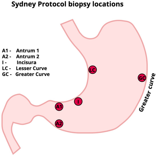 Sydney protocol for chronic atrophic gastritis. Sydney protocol biopsies should be taken in patients with endoscopic evidence of CAG and/or gastric IM; these allow histological confirmation and staging of extent to help with risk stratification and surveillance planning. Biopsies should be taken and sent in separate pots from the antrum (site A1 and A2), incisura (site I), lesser curve (site LC) and greater curve (site GC). Documentation of the location of the atrophic border if visible endoscopically, and the endoscopic staging using the modified Kimura–Takemoto system, helps standardise reporting.