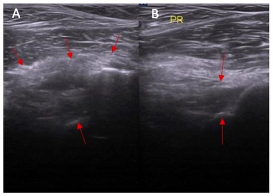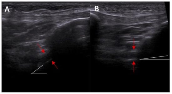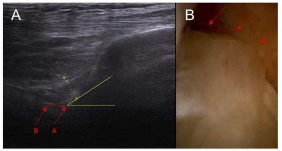 The inclination of the ACL—the ultrasound view (ACL is marked with red arrows). (A) normal = 45 degrees angle between extension of posterior border of the ACL and base line and (B) abnormal < 40 degrees angle between extension of posterior border of the ACL and base line.