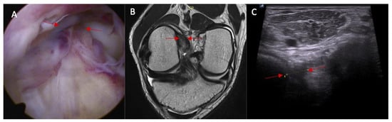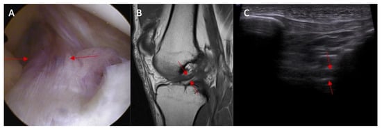 (A) ACL tear confirmed in arthroscopy view and MRI examination; (B) (marked with red arrows); and (C) abnormal inclination of the ACL in ultrasound view.
