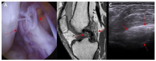 (A) ACL tear confirmed in arthroscopy view. Swelling of the ACL/PCL compartment with change of the morphology of the posterior joint capsule complex in (marked with red arrows) MRI view (B) and ultrasound view (C).