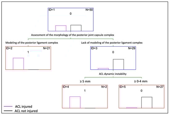 Based on the statistical analysis, a decision tree for the diagnosis of an ACL injury from an ultrasound image was proposed (Figure 8). The decision tree created using the Statistica 13.3 software includes two modeling variables for the assessment of the morphology of the posterior joint capsule complex and dynamic instability (The choice of these two parameters is guided by the decision tree algorithm. The algorithm decides which variables best divide the study group, thereby yielding the best matching). Using the available database, the decision tree made only one incorrect matching, which translates to an accuracy of 98%. Based on the decision tree, it can be assumed that patients with the CL modeling of the posterior ligament complex have an ACL injury. In the remaining patients, dynamic instability should be additionally assessed. If it is ≥5 mm, then it can be assumed that an ACL injury is present.