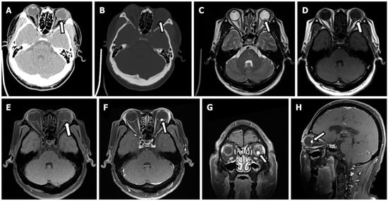 Computed tomography and magnetic resonance imaging of left retinal hemangioblastoma. (A): Computed tomography (CT) transverse soft tissue window of orbit showed punctate calcification on the posterior wall of the left eye ring and small patchy soft tissue density in the posterior part of the eyeball. The lesion measured about 5 mm × 8 mm, with an ill-defined border; (B): CT transverse bone window of orbital showed no obvious abnormal change of orbital bone; (C): The lesion was hypointense on transaxial T2-weighted sequence; (D,E): The lesion was slightly hyperintense on transaxial T1-weighted images (D) and transaxial T1-weighted + fat-suppression images (E); (F–H): Left posterior para-bulbar lesions were significantly enhanced on gadolinium-enhanced T1-weighted + fat-suppression images (White arrows represent lesion). Reprinted from Tang et al. [15].