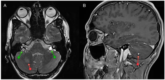 Magnetic resonance of a cerebellar haemangioblastoma and bilateral endolymphatic sac tumors (Author’s own material). (A) The T2 sequence shows an edema of tissue surrounding the hemangioblastoma (marked with orange arrow), medially and posteriorly to the vestibule two hyperintense tumors with typical “salt and pepper” appearance (green arrows). The tumors were post-operatively confirmed in histopathology as endolyphatic sac tumors in a von Hippel-Lindau patient. (B) The T1 sequence reveals a hyperintense hemangioblastoma located in the right cerebellum with a typical nodular appearence (orange arrow).