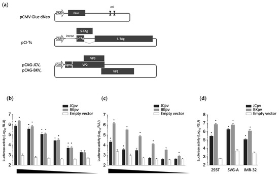Generation of reporter pseudoviruses. (a) Schematic representation of the reporter plasmid (pCMV Gluc dNeo), T antigen expression plasmid (pCI-Ts), and capsid expression plasmids (pCAG-JCV and pCAG-BKV). Positions of the CMV promoter (CMV), Gaussia luciferase-encoding gene (Gluc), SV40 origin (ori), SV40 T antigen, capsid proteins (VPs) of HPyVs, and CAG promoter (CAG) are shown. To generate the pseudoviruses, HEK293T cells were cotransfected with three plasmids: pCMV Gluc dNeo, pCI-Ts, and one of the capsid expression plasmids. (b,c) Luciferase activity in HEK293T cells infected with each class of pseudovirus. Pseudoviruses, obtained as either the sonication lysate of transfected cells (b) or culture supernatant of transfected cells (c), were subjected to serial dilution and inoculated onto naïve HEK293T cells. Luciferase activity was measured in the resulting spent culture medium at 3 days post-inoculation. (d) The susceptibility of SVG-A or IMR-32 cells to JCpv and BKpv. The extracts from transfected cells were inoculated onto HEK293T, SVG-A, or IMR-32 cells, and luciferase activity in the resulting spent culture medium was measured at 3 days post-inoculation. The statistical significance of differences between control (empty vector) and each pv was evaluated using Student’s t-test (* p < 0.001 vs. control).