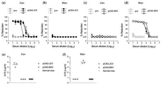 To examine whether infections by JCpv or BKpv were neutralized by specific anti-sera, mice (n = 3) were immunized by IM injection with pCAG-JCV or pCAG-BKV. Sera from immunized mice were analyzed by neutralization assays with JCpv and BKpv. All three mice immunized with pCAG-JCV showed high neutralizing activity against JCPyV (Figure 2a), and no or minimal neutralizing activity against BKpv (Figure 2b). In contrast, all three mice immunized with pCAG-BKV showed no or minimal neutralizing activity against JCpv (Figure 2c), and high neutralizing activity against BKpv (Figure 2d). To evaluate the background levels of this assay, a large number of samples from individuals with negative responses should be tested. However, it is difficult to collect a true negative human sample due to the high prevalence of antibodies to JCPyV and BKPyV in even healthy individuals. Therefore, in this study, serum from normal mice (n = 30) was used as a negative control for neutralization of JCpv and BKpv. The data clearly showed that all normal mice serum had no neutralizing activity against JCpv and BKpv (Figure 2e,f). These results suggested that reporter JCpv and BKpv can be used to detect specific neutralizing antibodies against each PyV with minimal cross-reactivity.