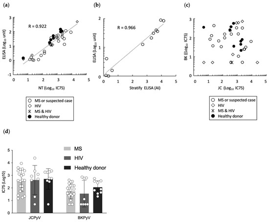 JCPyV causes PML under conditions of immune impairment, and an ELISA-based serum test to detect antibodies specific for JCPyV, has been used in clinical practice for PML risk stratification [16,17]. Therefore, we conducted the neutralization assay of sera from patients with MS and HIV, as well as healthy donors, using JCpv, and compared the neutralization assay antibody titers to those obtained with VLP-based ELISA [15]. This experiment employed serum samples from 9 healthy donors, 21 patients known or suspected to have MS, and 8 HIV-positive patients, including 1 HIV-positive patient with MS. Overall, a strong positive correlation (Y = −0.77411 + 0.75779 × X, R = 0.922) was detected between neutralization titer (IC75) by JCpv and antibody titer by VLP-based JCV ELISA (Figure 3a), suggesting that the neutralization assay with JCpv might serve as an alternative test to antibody measurement by ELISA. Indeed, the ELISA titer that we obtained exhibited a strong correlation (Y = 0.03911 + 0.42877X, R = 0.966) with the antibody index determined using a second-generation anti-JCV antibody assay (STRATIFY JCV DxSelect; Biogen, Cambridge, MA, USA) [17] (Figure 3b). At the same time, the IC75 values against JCpv and BKpv did not show a correlation (Figure 3c). Furthermore, the neutralizing titers against both JCPyV and BKPyV did not differ significantly among healthy donors, patients with MS, or patients with HIV by one-way analysis of variance using EZR software (version 1.61, freely available) [Figure 3d, Pr(>F) = 0.326]. Additional larger trials, along with longitudinal research, will be needed to clarify the relationship between neutralizing activity and disease condition, especially in the context of risk stratification.