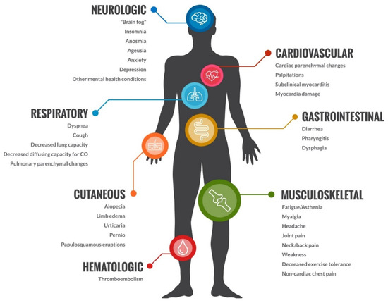 - Akbarialiabad, H.; Taghrir, M.H.; Abdollahi, A.; Ghahramani, N.; Kumar, M.; Paydar, S.; Razani, B.; Mwangi, J.; Asadi-Pooya, A.A.; Malekmakan, L.; et al. Long COVID, a Comprehensive Systematic Scoping Review. Infection 2021, 49, 1163–1186. [Google Scholar] [CrossRef]