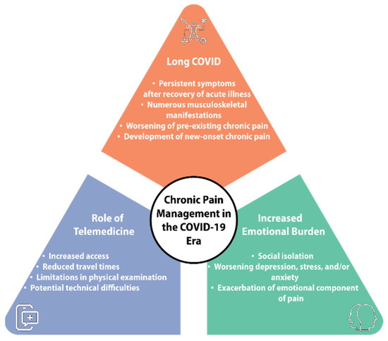 The prevalence of new-onset post-COVID-19 musculoskeletal pain was 73.2% [74]. This increased risk was likely due to a combination of cognitive, physical, and psychological factors brought on by the COVID-19 pandemic [75]. Patients with chronic pain are more likely to experience anxiety, depression, and poor sleep quality, which can all contribute to a lower quality of life [75]. Studies have shown that 65% of patients with depression complain of one or more loci of pain [76]. Chronic pain and depression have been demonstrated to activate intersecting brain structures, such as the thalamus, prefrontal cortex, and anterior cingulate cortex [77]. Additionally, the social isolation experienced by many during the pandemic worsened the experience of chronic pain and contributed to the development of depressive symptoms [78]. Accessibility to pain management services was also greatly diminished, exacerbating the dilemma of those suffering from chronic pain [79]. Due to the closure of many clinics and transition to telemedicine, patients were unable to access the same level of multidisciplinary care. In a sample of users of prescribed or over the counter pain medicines during the pandemic, 38% reported changes to their existing regimen, whereas 68% of patients reported changes to their non-pharmacologic pain management approaches [80]. The most common reasons for increased necessity of medication included changes in pain symptoms due to the pandemic, increased doses to compensate for lack of other physical or psychosocial interventions, or lack of access to providers [80].