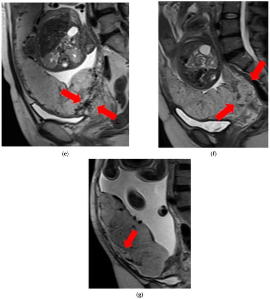 Figure 1. Examination of magnetic resonance imaging features in the spectrum of placenta accreta with placenta previa disorder reveals the following characteristics: (a) T2 dark bands, indicating areas of low signal intensity on T2-weighted images (arrows). (b) Placental heterogeneity, depicting varied signal intensity within the placenta due to recurrent hemorrhages or lacunae (arrows). (c) Placental bulge, characterized by the protrusion of the lower segment of the uterus caused by the mass effect of the placenta, typically towards the bladder (arrow). (d) Placental cervical protrusion, showcasing the extension of placental tissue into the cervical canal (arrow). (e) Abnormal vascularization of the placental bed, featuring noticeable vessels in the placental bed with disruption of the uteroplacental interface (arrows). (f) A focal exophytic mass, indicating the protrusion of placental tissue through the uterine wall and beyond (arrows). (g) Myometrial thinning, demonstrating a reduction in myometrial thickness over the placenta to <1 mm or even making it invisible (arrow). - Placental heterogeneity: uneven signal intensity observed inside the placenta, often due to repeated bleeding (Figure 1b).
