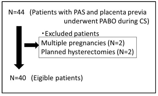 In the present study, 40 patients with PAS and placenta previa underwent PABO during a CS. Four patients were excluded because of multiple pregnancies (n = 2) and planned hysterectomies (n = 2). The clinical characteristics and MRI features of the two groups are summarized in Table 1 and Table 2. Figure 3 shows a flowchart of the inclusion–exclusion process.