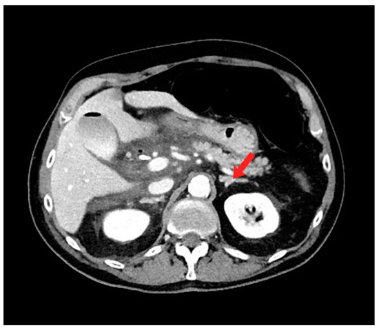 Axial computed tomography (CT) image shows moderate free fluid adjacent to the extrahepatic biliary system, pancreatic head, and proximal duodenum. Note the normal appearance of the left adrenal gland (red arrow).