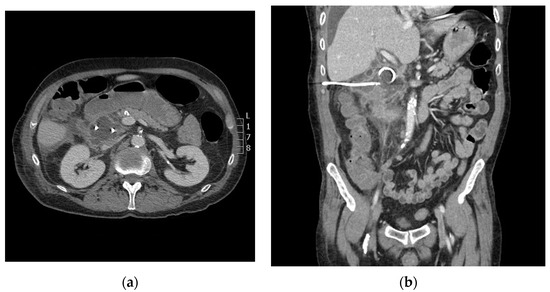 Axial (a) and coronal (b) computed tomography (CT) imaging shows periduodenal drain placement with a 10 French catheter.