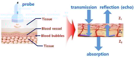 Impedance matching is crucial for preventing air penetration between the probe and the skin, as shown in Figure 11. This ensures that the acoustic transmission coefficient (T), as per Equation (7), is optimized. In this context, T should be close to 1 for optimal performance, and the analyzed value for T was determined to be 1.76 [33,34].