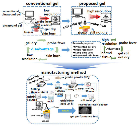 The design of a pad-type gel using gelatin is innovative, and the soft solid pad is proposed to replace liquid gel, as shown in Figure 2. The proposed method seeks to obtain results using gelatin. For this purpose, the gel production method and simulation method to prove the results were analyzed, and the ATS-539 test phantom was used to obtain the results. This study evaluated the performance of the proposed gel pad through video-ultrasound virtual diagnosis and sought to prove the superiority of the results. To achieve this goal, the overall flow process for research and obtaining results was introduced, as shown in Figure 2.