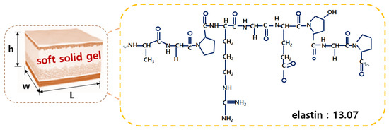 To obtain the elastin ratio corresponding to the conventional gel and gelatin material, the moisture rate (M) was calculated using Equation (3) [25]. The conventional gel was formulated from propylene glycol (CH3 CH COH CH2 OH) with a density of 1.04 g/cm3, while the chemical formula of the gelatin was a combination of collagen, alkali, and protein (C6H12O6), and its density was 1.2 g/cm3, respectively. The gelatin was higher in elastin than conventional gel due to its high density [25].