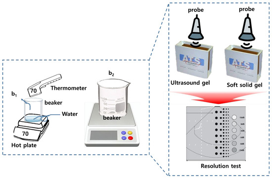 For silicon applications, acoustic properties, photoacoustic generation, backscattering, homogeneity, processing complexity, compatibility, cost, and availability are important [12,14,15]. However, the speed and reflection (echo) characteristics of sound waves may be adversely affected due to impedance differences between the ultrasound probe, tissue, and silicone material [13]. Therefore, to overcome these problems, this paper proposes a method of producing a soft solid gel that can be used for a long time by enabling reproducibility within the range where the gel is not dried. A soft solid gel was produced using a gelatin component that has impedance similar to that of human skin, and imaging tests and analysis were performed by using a test phantom (ATS-539) to obtain the results.