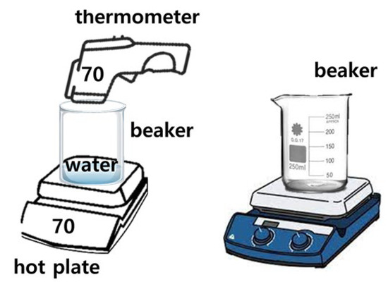 Figure 2 shows the manufacturing process and the apparatus used for soft solid gel preparation. The time required for the proposed soft solid gel’s preparation is also indicated. The figure shows the production process of edible gelatin (Dongsung Kit Co., Ltd., Seoul, Republic of Korea) by melting it using a hot plate. An infrared (IR) thermometer (UT302C thermometer @ Unit) was employed to monitor and record the temperature during the soft solid gel preparation. A 50 mL beaker was used to mix the gelatin and saline solution, with stirring accomplished using a 30 cm horizontal bar. In addition, a frame measuring 9.5 (W) × 21.5 (L) cm × 1 cm (h) was prepared to hold a Falcon tube (45 mL) containing the gelatin liquid, as shown in Figure 3. This was stored in a refrigerator.