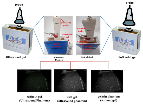 In the present study, a conventional ultrasonic gel, the proposed soft solid gel, a probe (with an output frequency of 3.5 MHz) [23], and an ultrasonic evaluation soft solid gel (ATS-539) were used for ultrasound examination. The ATS-539 is typically used for ultrasonic testing. Experiments were conducted to compare the performance of the conventional ultrasonic gel and the proposed soft solid gel, as shown in Figure 7.