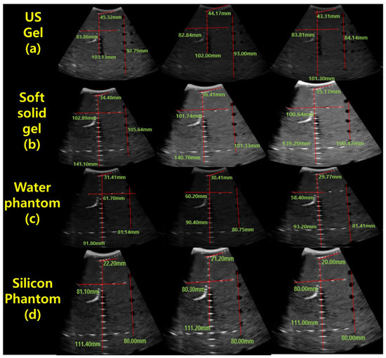 Figure 9a–d show the comparative evaluation of performance when using ATS-539 with different types of ultrasound gels, including the proposed gelatin gel, water-based soft solid gel, and silicon-based soft solid gel. In Figure 9a, the imaging results show the ATS-539 used with a probe coated with ultrasound gel. Figure 9b presents the results obtained from testing the soft solid gel fabricated for this experiment. Furthermore, Figure 9c,d exhibit the imaging results obtained from testing commercially available water-based soft solid gel and silicon-based soft solid gel, respectively.
