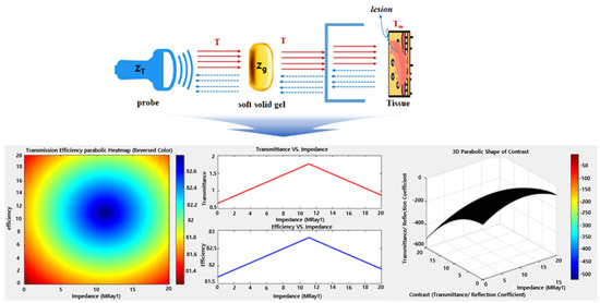 In this case, the impedance of the ultrasound probe and the proposed gelatin material must be matched for the ultrasound to be effectively transmitted to the target. Therefore, as per Equation (6) and as shown in Figure 10, the matched impedance (ZM) was calculated to be 11.13 MRay1 [33].