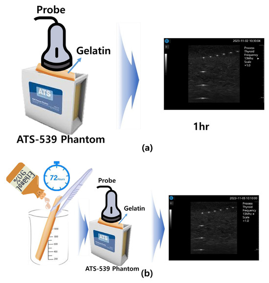 The thermal conductivity values of the conventional gel and gelatin powder were 0.34 W/m-K and 0.55 W/m-K, respectively, with a temperature range of 70 °C to 90 °C at 50% H2O [25,26]. Ultrasonic reflection (echo) is crucial for high-resolution monitoring [27]. To evaluate the performance of the proposed method, the first experimental approach involved conducting experiments based on physical simulations and numerical results to substantiate the findings. The second method utilized the ATS-539 phantom, commonly used for performance testing, to demonstrate the excellence of the experimental results through image evaluations.