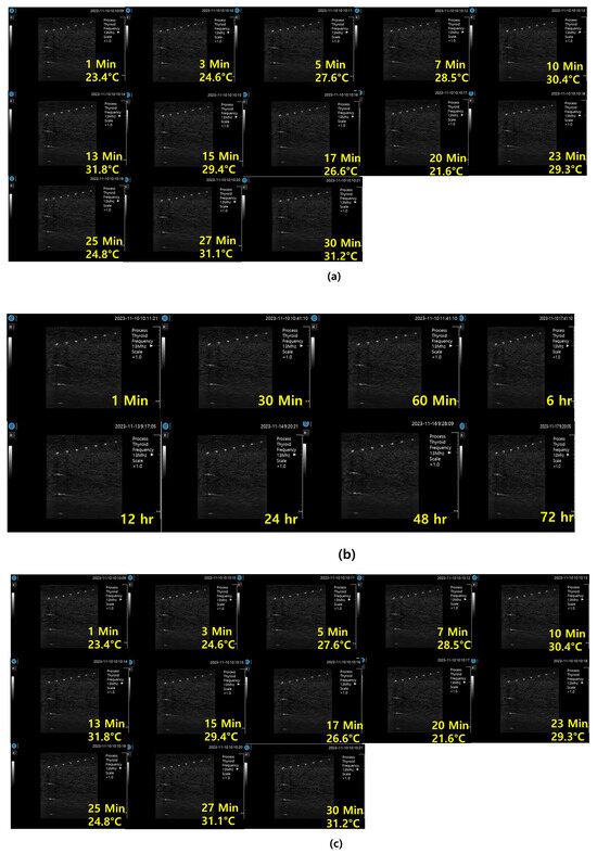 This experiment, conducted using a soft solid gel, did not require approval from the Institutional Review Board (IRB) for human experiments. It is crucial to use the proposed soft solid gel to avoid the temperature impact on the ultrasound probe. Traditional gels tend to dry out after approximately 15 min, leading to a degradation in image quality during diagnostic evaluations [36,37,38,39,40,41,42,43,44], although there are existing research results that indicate images come out better in obese patients [45]. The experimental results, as shown in Table 2, indicate that the gel began to dry out around 15 min. Beyond this time frame, additional gel application would be inconvenient. However, if the proposed soft solid gel was used, the probe was not affected by heat and the gel could be used for a long time. Therefore, the gel achieved clear image quality regardless of environmental conditions.