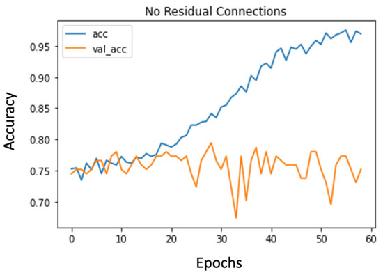 The first observation was that the residual connections seemed to hamper the learning process. This was because now, the early layers had to learn all the complex features needed for the final dense classification and they could not solely focus on learning more general patterns that would be used by later layers. Figure 2 and Figure 3 present the accuracy plots from models without and with residual connections. We can see that without residual connections, the model is able to overfit and thereby learn patterns in the images more effectively. Although the overfitting behavior is not ideal, it lowers bias, which is an essential preliminary step.