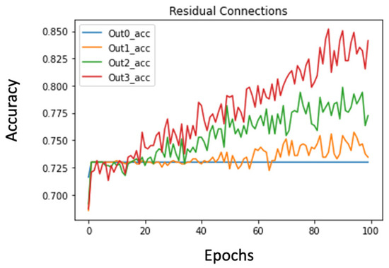 Accuracy plot from different levels of residual connections. Higher accuracies at later layers highlights the fact that extra layers are still allowing the model to learn more useful representation.