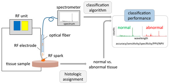 Setup of optical emission spectroscopy (OES) measurements with ex vivo breast tissue samples: Electrical current from a radiofrequency (RF) unit is applied via an active RF needle electrode to a tissue sample. RF sparks excite atoms and molecules derived from tissue fragments. Emitted light is collected via an optical fiber and recorded with a high-resolution optical emission spectrometer. The histologic assignment of tissue samples to either normal or abnormal tissue (mixtures were excluded from analysis) is correlated with the corresponding spectra, evaluating classification performance of normal vs. abnormal breast tissue applying machine learning algorithms. Afterwards, classification performance of included tissue samples is evaluated by accuracy, sensitivity, specificity, positive and negative predictive value (PPV and NPV).