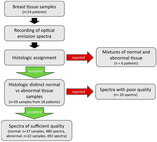 Overview of the workflow of sample and data handling. Optical emission spectra were recorded on breast tissue samples of 24 patients. Histologic assessment of tissue samples revealed mixtures of tissue types for 6 patients, whose tissue samples were excluded from further analysis. The remainder tissue samples of 18 patients were included into analysis, only 20 individual spectra dropped out due to poor quality. Finally, a total of 480 spectra from 37 normal and 492 spectra from 22 abnormal tissue samples were included into evaluation.